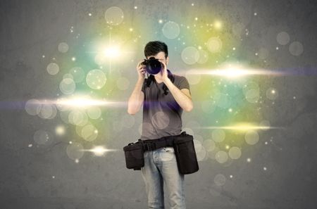 A young amateur photographer with professional camera equipment taking picture in front of grey wall full of colorful bokeh and glowing lights concept