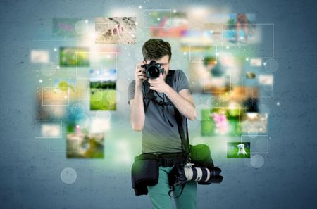 A young amateur photographer with professional camera equipment taking picture in front of blue wall full of faded pictures and glowing lights concept