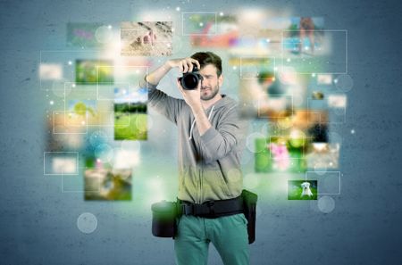 A young amateur photographer with professional camera equipment taking picture in front of blue wall full of faded pictures and glowing lights concept