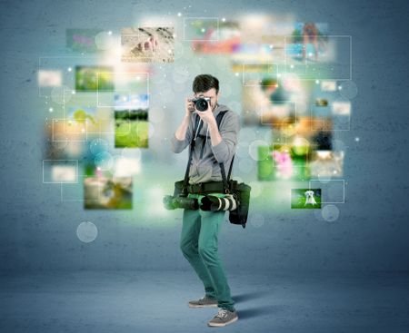 A young amateur photographer with professional camera equipment taking picture in front of blue wall full of faded pictures and glowing lights concept