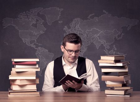 A young ambitious geography teacher in glasses sitting at classroom desk with pile of books in front of world map drawing on blackboard, back to school concept.