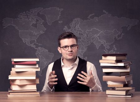 A young ambitious geography teacher in glasses sitting at classroom desk with pile of books in front of world map drawing on blackboard, back to school concept.