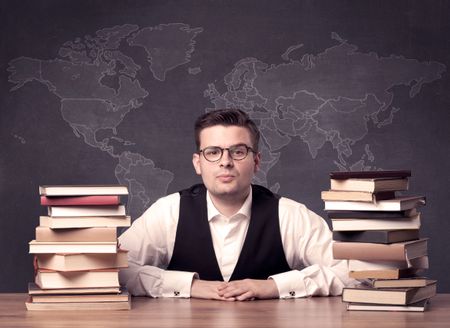 A young ambitious geography teacher in glasses sitting at classroom desk with pile of books in front of world map drawing on blackboard, back to school concept.