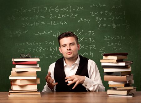 A young ambitious teacher in glasses sitting at classroom desk with pile of books in front of blackboard full of math calculations, numbers, back to school concept.