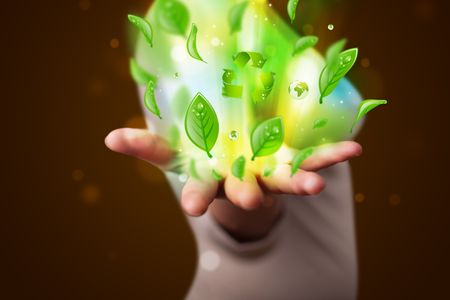 Young beautiful woman presenting eco green leaf recycle energy concept