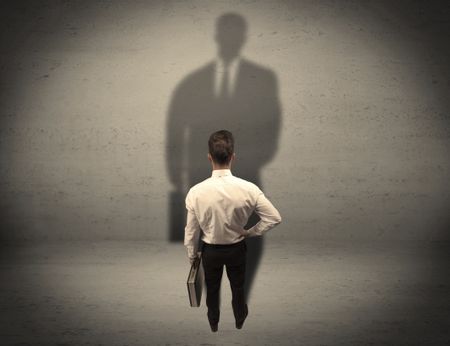 A young beginner salesman standing in front of a wall, facing his shadow as his boss or a successful businessman he lloks up to concept