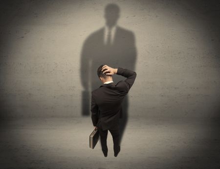 A young beginner salesman standing in front of a wall, facing his shadow as his boss or a successful businessman he lloks up to concept