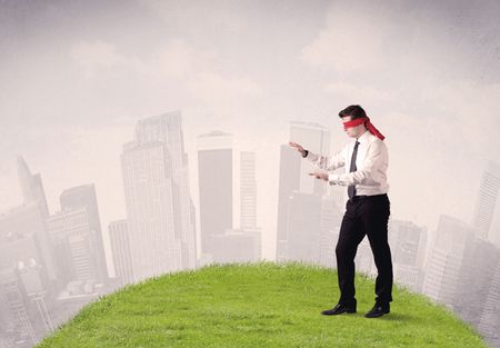 Young blindfolded businessman steps on a a patch of grass with a cloudy city in the background