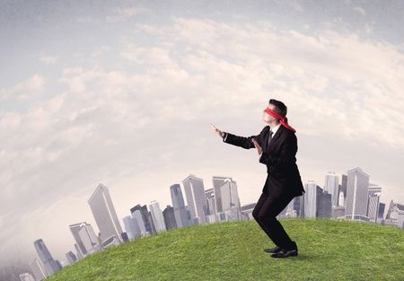 Young blindfolded businessman steps on a a patch of grass with a grey buildings in the background