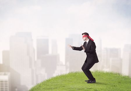 Young blindfolded businessman steps on a a patch of grass with a city in the background