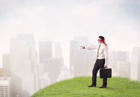 Young blindfolded businessman steps on a a patch of grass with a city in the background