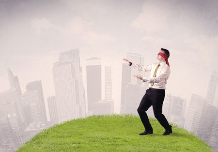 Young blindfolded businessman steps on a a patch of grass with a cloudy city in the background