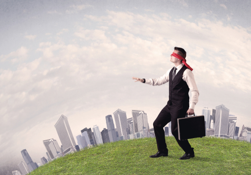 Young blindfolded businessman steps on a a patch of grass with a grey buildings in the background