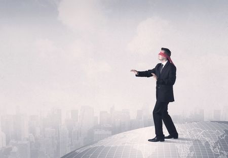 Young blindfolded businessman steps on a grey world map with a city in the background