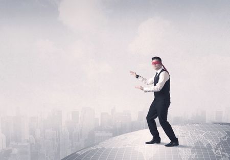 Young blindfolded businessman steps on a grey world map with a city in the background