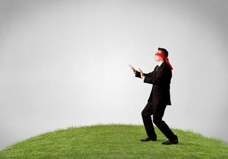 Young blindfolded businessman steps on a patch of grass