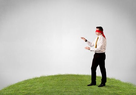 Young blindfolded businessman steps on a patch of grass