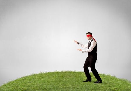 Young blindfolded businessman steps on a patch of grass