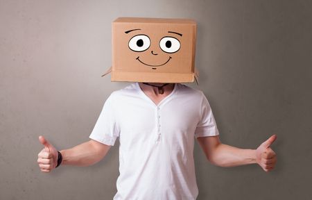Young boy standing and gesturing with a cardboard box on his head