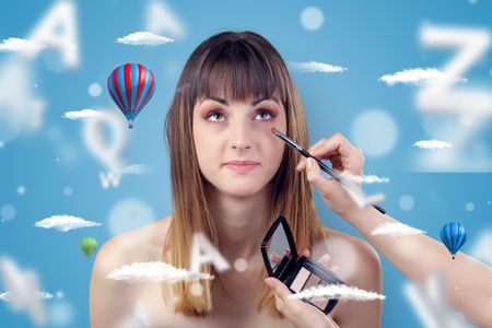 Young brunette woman smiling at hairdresser with clouds and air balloons around