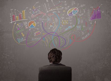 Young business man looking at sketches of graphs and symbols on the wall