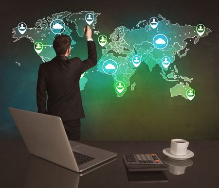 A young business manager working on a global sales strategy and drawing on illustrated map of the world concept