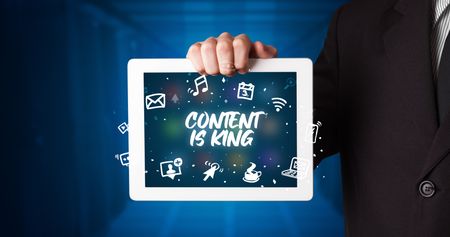 Young business person working on tablet and shows the inscription: CONTENT IS KING
