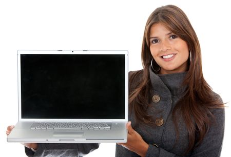 Young business woman with a laptop - isolated on white
