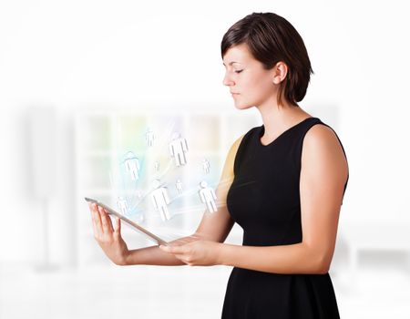 Young business woman looking at modern tablet with social icons