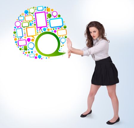 Young business woman presenting colourful speach bubble on bright background