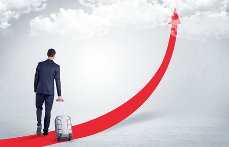 Young businessman with back leaving on the red arrow carpet to the skies with luggage on his hand
