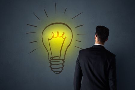 Young businessman in black suit standing in front of a drawn yellow lightbulb