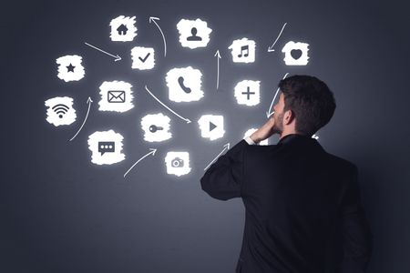 Young businessman in black suit standing in front of white multimedia icons