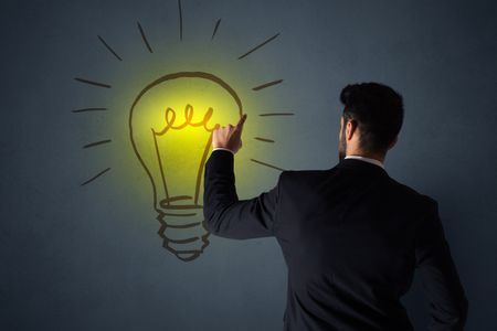 Young businessman in black suit standing in front of a drawn yellow lightbulb