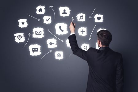 Young businessman in black suit standing in front of white multimedia icons