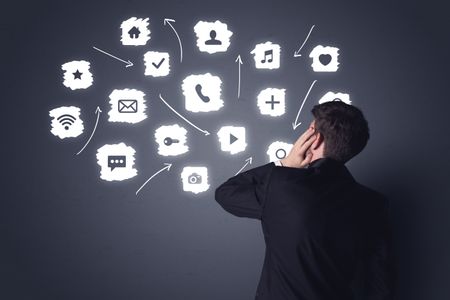 Young businessman in black suit standing in front of white multimedia icons