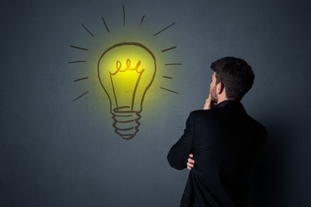 Young businessman in black suit standing in front of a drawn yellow lightbulb
