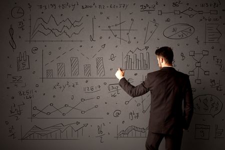 Young businessman in black suit standing in front of detailed calculations