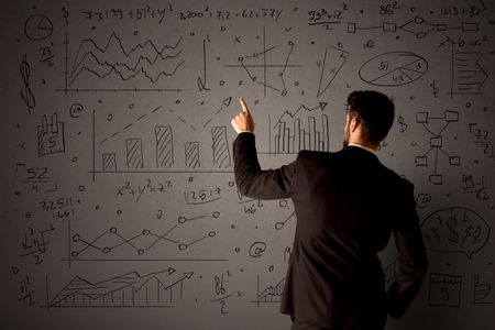 Young businessman in black suit standing in front of detailed calculations