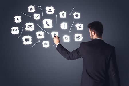 Young businessman in black suit standing in front of white multimedia icons
