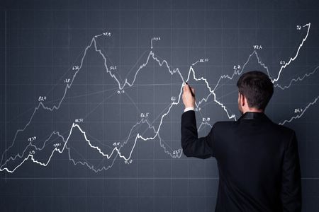 Young businessman in black suit standing in front of a progress chart