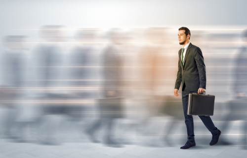 Young businessman with briefcase hurry up on a crowded street with blurred people around
