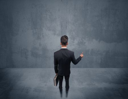 A young businessman with briefcase standing in blank empty space facing a grey urban wall, scratching his head concept.