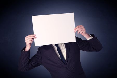 Young businessman hiding behind a blank piece of paper