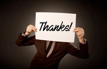 Young businessman hiding behind an expression of gratitude drawn on paper