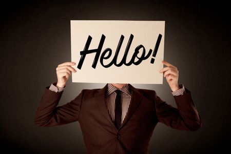Young businessman hiding behind a greeting drawn on paper