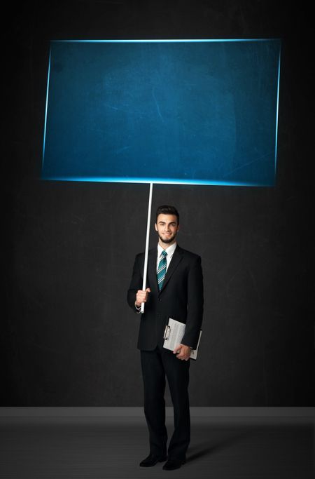 Young businessman holding a big, blue board