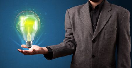 Young businessman holding glowing lightbulb in his hand