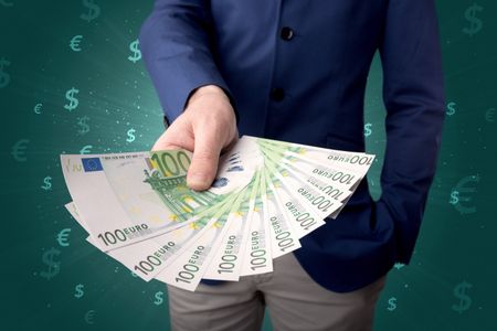 Young businessman holding large amount of bills with green background and currency symbols