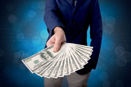 Young businessman holding large amount of bills with shiny blue background